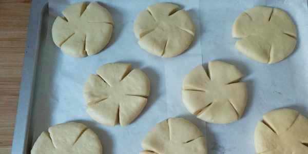 第11步:烤盤鋪油紙,把面包生坯放入烤盤,烤盤送入烤箱讓面包生坯發酵至2倍大。