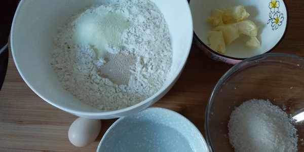第1步:準備好所需材料:高筋面粉250g、奶粉10g、酵母3g、黃油35g、白砂糖50g、水100毫升、雞蛋1個約35g。