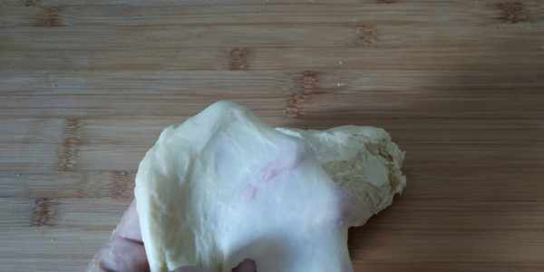 第7步:面團裡揉入雞蛋、黃油、鹽基本上也能拉出薄膜瞭,面團能拉出膜,做出的面包細膩又松軟。