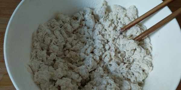 第3步:先把奶粉、酵母與面粉攪拌均勻,然後倒入糖水,邊攪拌邊倒入,拌成面絮,用手搓成面團。