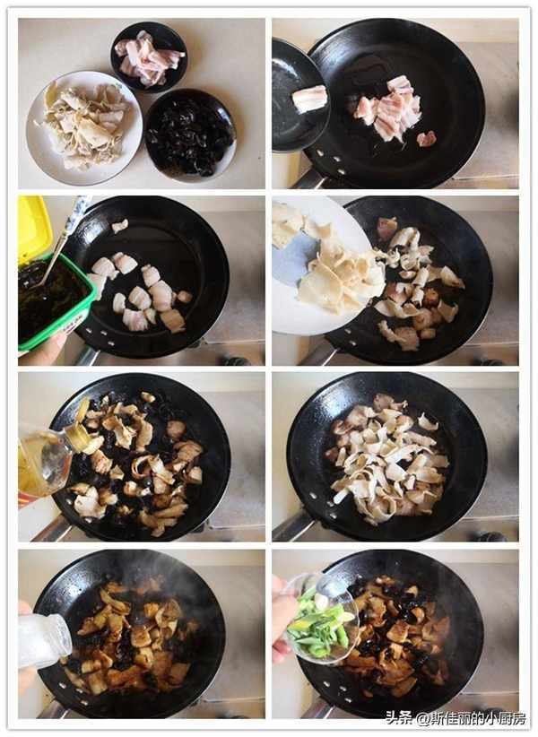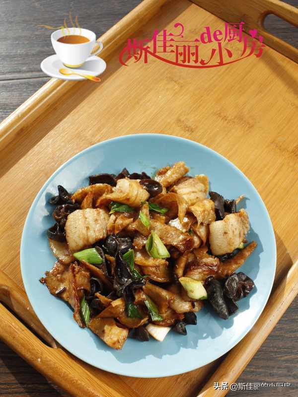 小貼士:1. 黑木耳提前用冷水泡軟;2. 先用少許油煸炒五花肉, 將五花肉煸炒至微微出油,再加入1勺黃豆醬來增香提味去腥; 將它們混合在一起,加入少許調味汁, 燜上兩分鐘,加入鹽調味, 最後放入青蒜進鍋翻炒變色即可。