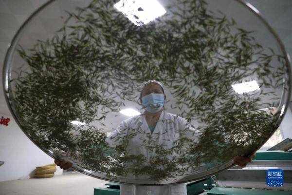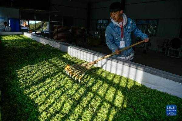 4月2日,工人在貴州省貴陽市神鵲茶場攤晾春茶。 新華社記者 楊文斌 攝