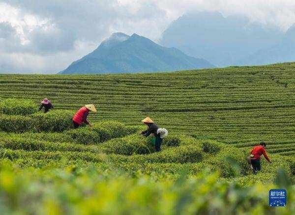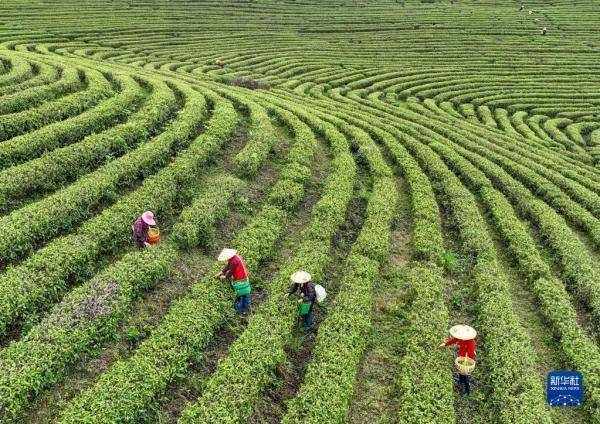 4月1日,茶農在湖南省懷化市通道侗族自治縣九層嶺茶園采摘明前茶。 新華社發(粟勇主 攝)