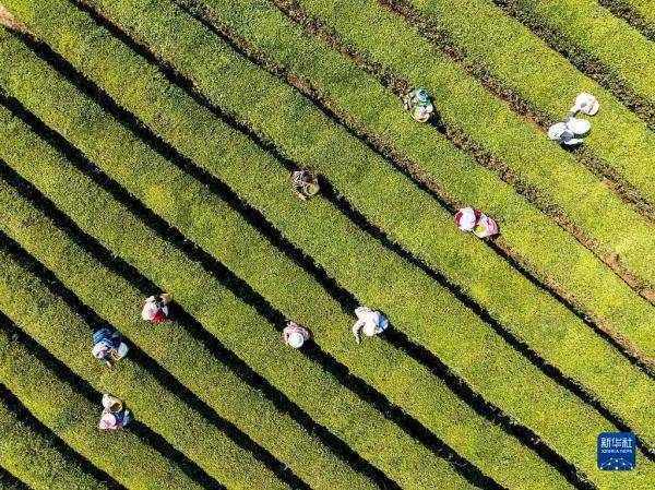 4月2日,采茶工在湖南省永州市江華瑤族自治縣濤圩鎮牛牯嶺生態茶場采摘春茶(無人機照片)。 新華社發(蔣克青 攝)
