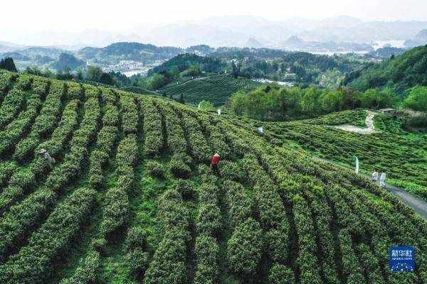 4月2日,村民在貴州省貴陽市神鵲茶場采摘春茶(無人機照片)。 新華社記者 楊文斌 攝