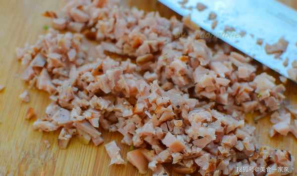 肉腸切成小粒備用。我用的早餐腸,可以用臘肉或者臘腸也很好。