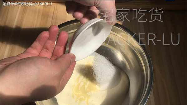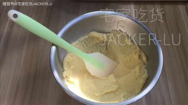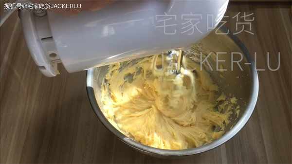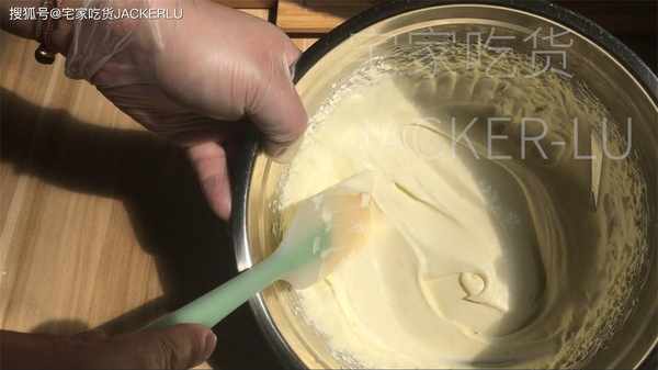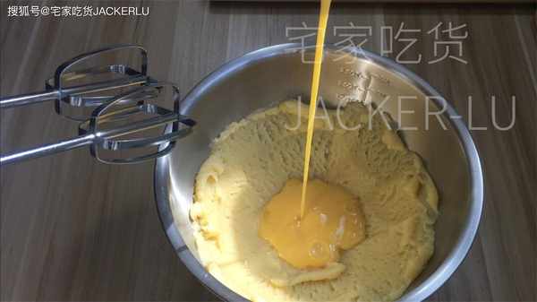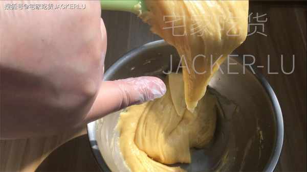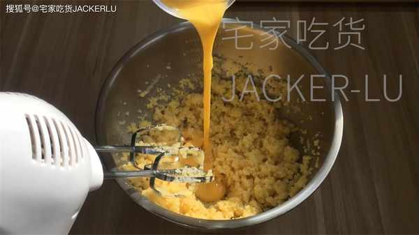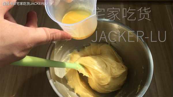 6、雞蛋液190克、分5-6次加入、可以用刮刀也可以用電動打蛋器,每次打發均勻後再加蛋液。