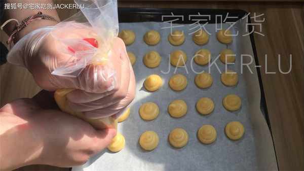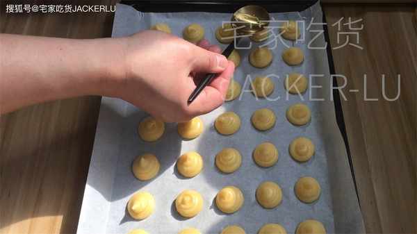 8、把泡芙面糊擠在烤盤上,每個之間留點膨脹的空間。擠好後取一個勺子背部粘水、把面糊尖角壓壓平。