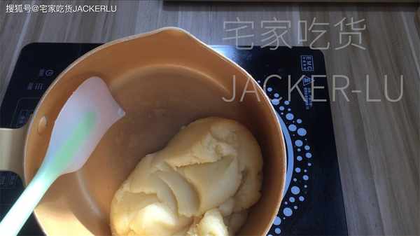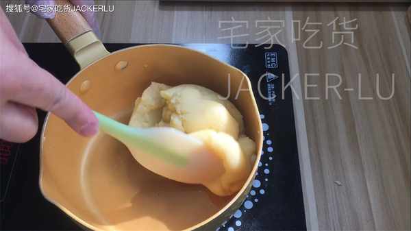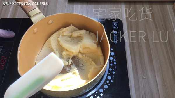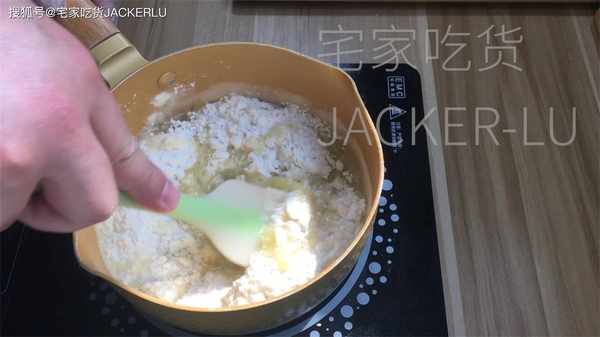 4、然後開最小火,慢慢用刮刀翻炒面團3分鐘左右,直到面團表面有光澤即可。(如果不是不粘鍋,抄到鍋底部有一層白膜即可)
