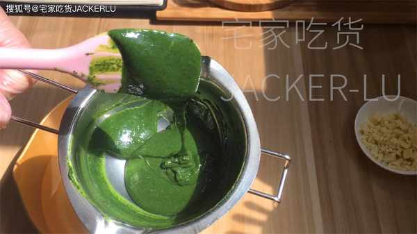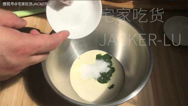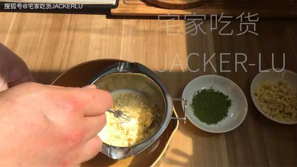 11、接著我們做抹茶奶油餡料,取白巧克力30克、淡奶油30克,隔熱水化開,加入抹茶粉6克,攪拌至抹茶完全融化,顏色均勻,放涼備用。