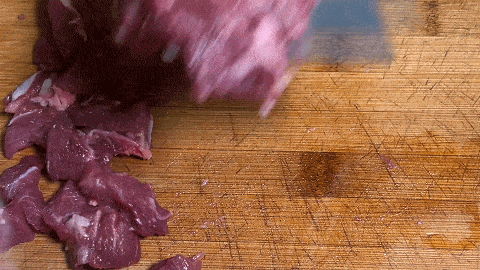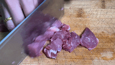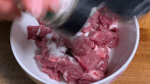 1、 雪花肉切成塊狀,加入食鹽,胡椒粉,淀粉,料酒,生抽和植物油,抓勻醃制10分鐘,這樣處理肉質嫩滑不柴,滑炒也不粘鍋