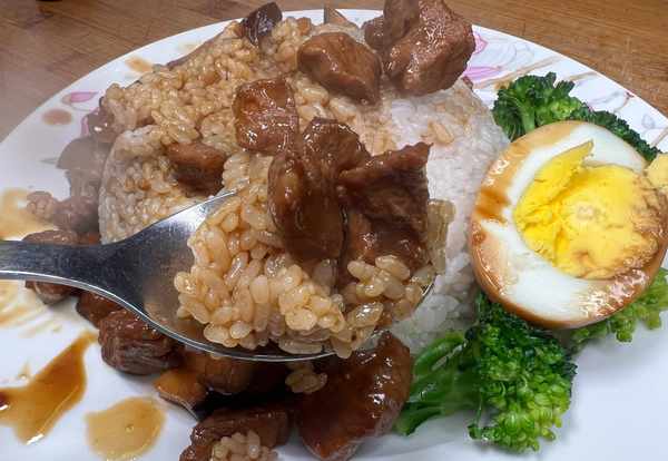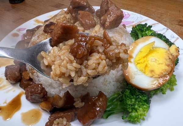 21. 將盤中拿掉,將香菇鹵肉和湯汁盛到米飯表面,在傢西蘭花和鹵蛋擺在邊上,美味即享