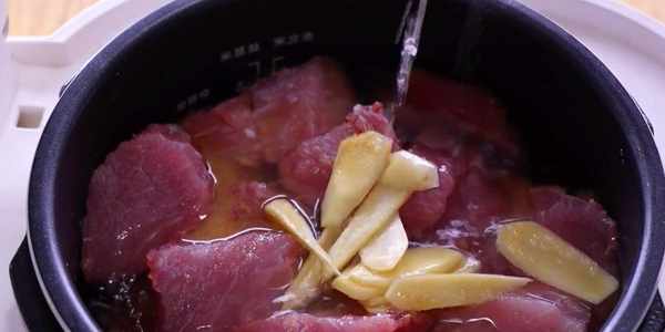3.準備一口高壓鍋,放入肉塊,加入生薑去腥,調入一大勺鹽,2勺白糖,三小圈的生抽。倒入沒過食材一大半的清水。蓋上蓋子,壓30分鐘。燃氣高壓鍋的話壓個20分鐘就可以瞭。上汽瞭記得轉小火。