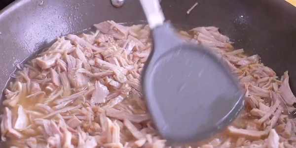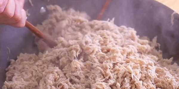 5.肉塊連同湯汁倒入炒鍋中,用鍋鏟把它壓碎,因為壓的很爛,輕輕一壓就碎瞭。