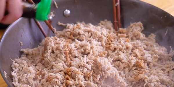 7.炒到稍微蓬松的時候轉用筷子挑,這樣能讓肉松更蓬松不塌陷。