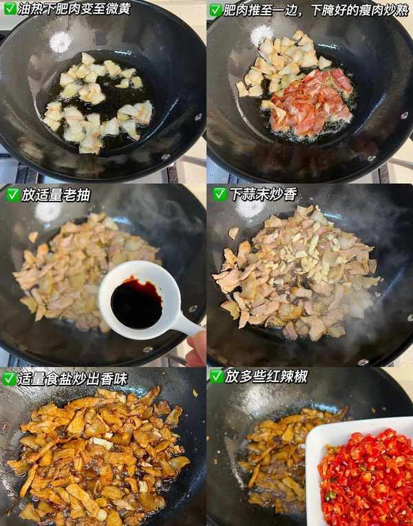1:起鍋燒油,油熱下肥肉小火煸炒出油脂,至五花肉處於微黃狀態,這樣的肥肉吃起來不膩