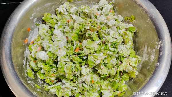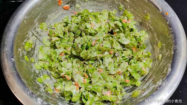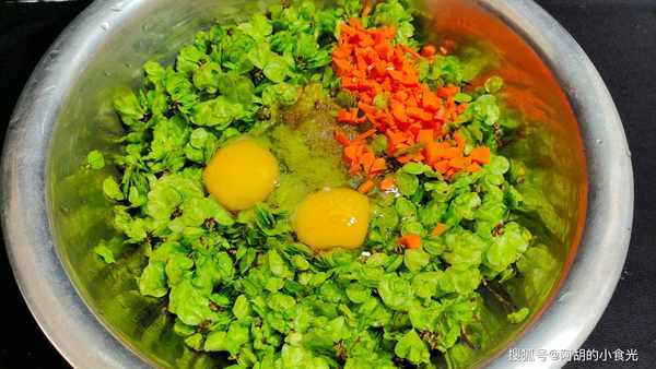 第二步:榆錢的水分瀝幹後,打入雞蛋兩個,十三香少許,加入蔥花一把,面粉一大勺,食鹽適量充分地攪拌均勻。