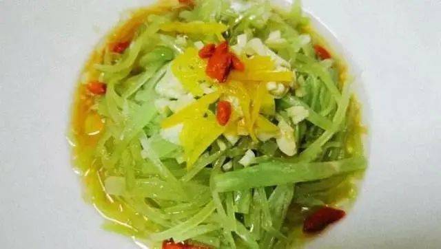 萵苣切掉上面的老葉,然後用削皮刀削掉它的老皮,然後切成細絲,水開後放點鹽和油,把萵苣絲下鍋,燙30秒後撈出來,用水沖涼控幹水分放在盆中。