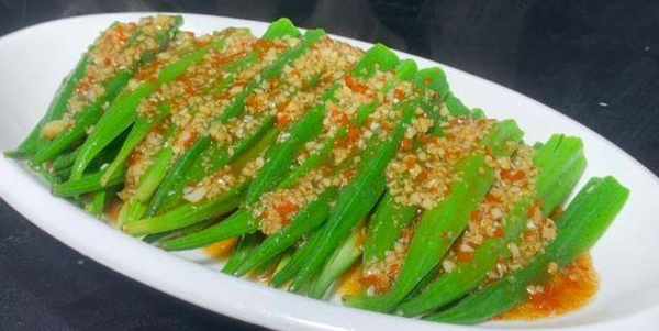 2、鍋中水開,再加入一小勺食鹽,食用油。再把秋葵焯水30秒鐘。撈出來過涼,擺入盤中,起鍋油熱後加入蒜末炒香。下入料汁熬至濃稠,然後把料汁均勻的淋在秋葵上面,蒜蓉秋葵就做好瞭。