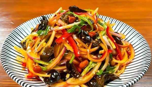 4、洋蔥醃好後,用清水清洗一下,控幹水分後倒入大碗中,加入蒜末,青紅辣椒,木耳,再加適量鹽,雞精,生抽,陳醋,辣椒油,芝麻油抓拌均勻。最後來點香菜和炸好的花生米,再次抓拌均勻就可以裝盤瞭。