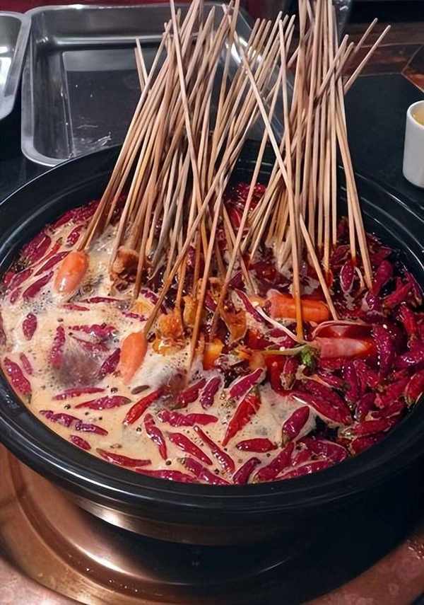 4.串串香:一種在四川成都流行的美食,選用各種食材串成小串,放在熱水中涮熟,再蘸上各種口味的醬汁,入口鮮美爽口,讓人回味無窮。