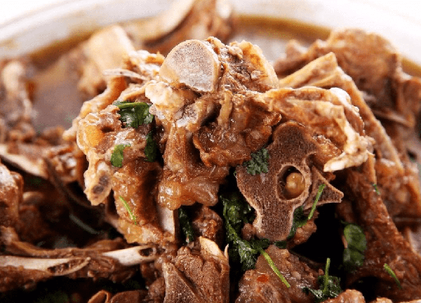 羊蠍子是用羊脊骨做的,羊脊骨泡一天的水,洗去浮沫後冷水下鍋,煮開將表面的血沫撇去,用秘制醬料包大火煮10分鐘,將醬香味煮出來後加入生抽、老抽上色調味,調到小火燉煮上2-3個小時,骨肉分離的狀態就可以出鍋瞭。