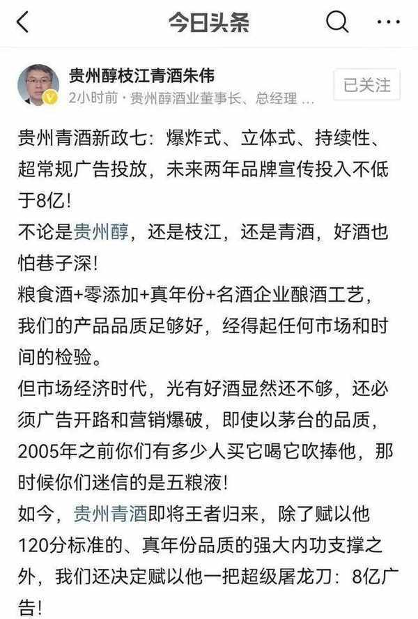 另一則是“貴州青酒計劃在未來兩年內,投入不低於8億元資金用於品牌宣傳”。