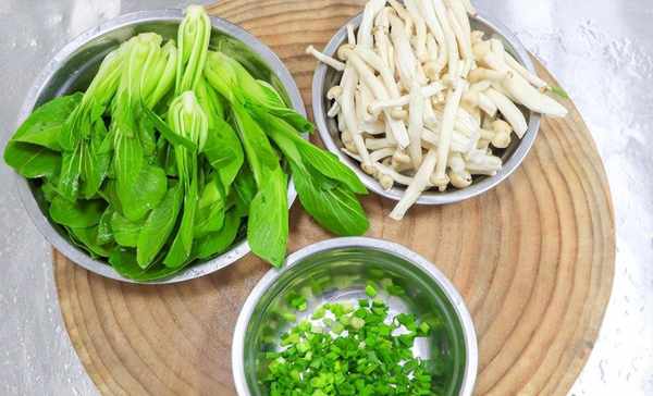 3、鍋內再加入一點食用油,油熱後下蟹味菇,加1g鹽翻炒,炒好後下蔥花再次攪拌均勻,即可倒出擺放在油菜中間。