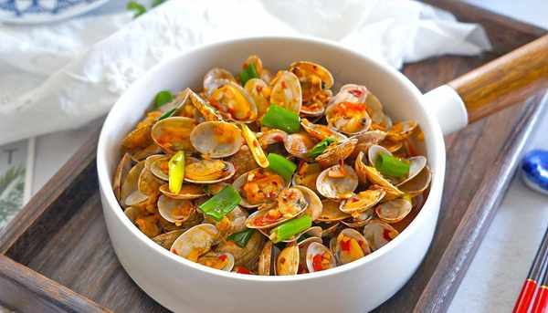 2、鍋中加水,水開後把花甲倒進去,再放兩片生薑去腥,煮熟後撈出備用。炒鍋中加入食用油,油熱後把蔥薑小米辣放進去炒香,香味激發後再把花甲倒進去翻炒。