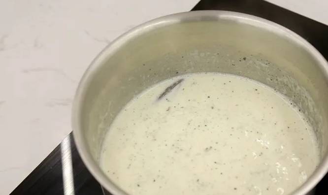 ②將香草籽刮出,連同空的香草莢都放入牛奶中,隨後加入糖和鹽,根據自己口味增減,但不建議舍去鹽,它有提味的作用。將牛奶煮沸後,放入米粒,轉小火煮15-20分鐘,期間可略攪拌,防止糊底。最後,使米粒吸收牛奶。