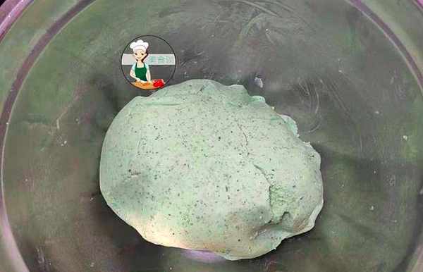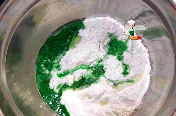 5、盆裡加入糯米粉、少許植物油、艾草汁混合揉成不粘手的糯米團。