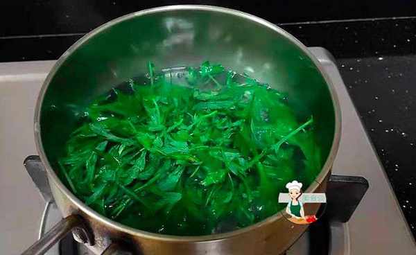 3、焯水好的艾草再回鍋,加入少許的清水煮沸。(把食材的味道煮出來。)