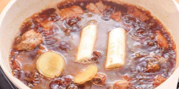 5.加入沒過排骨的開水,加入八角、生薑片、蔥段和調好的糖醋汁;加蓋,中小火燉煮45分鐘。