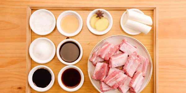 排骨/1斤、冰糖/1勺(約10g)、料酒/1勺(約5g)、老抽/1勺(約2g)、生抽/2勺(約10g)、細砂糖/3勺(約15g)、陳醋/3勺(約10g)、八角/1個、生薑片/2片、大蔥段/2段