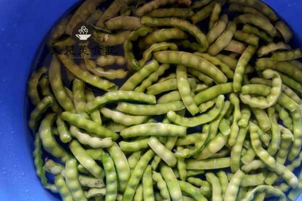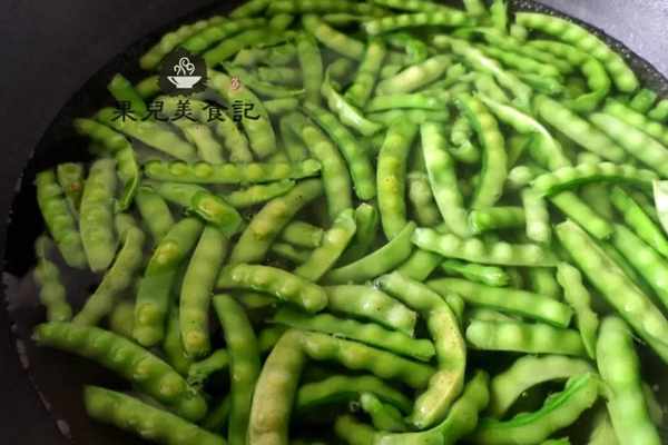 三、鍋中燒水,水開後倒入帶殼嫩豌豆,再放入適量鹽和一勺食用油焯水至嫩豌豆斷生至7成熟撈出,瀝幹水分備用,有些朋友在做帶殼嫩豌豆時沒有焯水,直接爆炒後加水燜煮,加水燜煮烹飪出來的帶殼嫩豌豆由於長時間的燜煮失去瞭原有的清香,顏色看起來也沒有那麼鮮嫩,焯水時加入油和鹽不僅能保持帶殼嫩豌豆的鮮嫩顏色,也縮短瞭後期烹飪時間,使做出來的豌豆吃起來更加鮮嫩,大傢以後在做這種帶殼嫩豌豆時記得一定要先焯水;