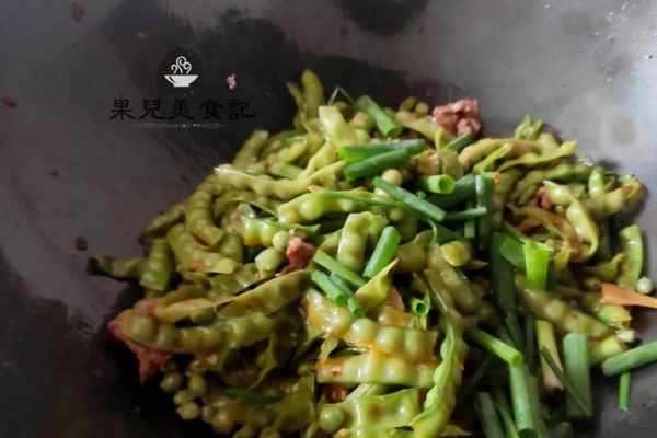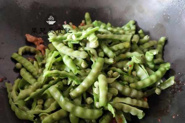 六、加入焯水後的帶殼嫩豌豆翻炒均勻;