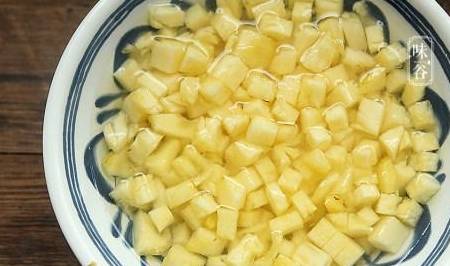 【做法】:1、菠蘿對半切開,先用小刀劃線,然後用勺子把菠蘿肉挖出,菠蘿肉用半個就行瞭,把它切成菠蘿粒,用鹽水浸泡30分鐘後倒掉水瀝幹,菠蘿需泡過鹽水後再吃,能使其中所含的一部分有機酸分解在鹽水裡,去掉酸味,讓菠蘿吃起來更甜。