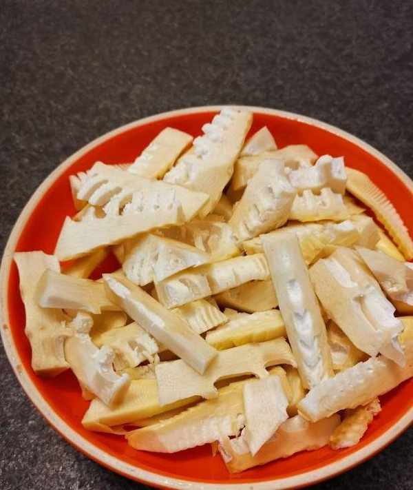 2、將剝好的竹筍洗凈,切成長條。