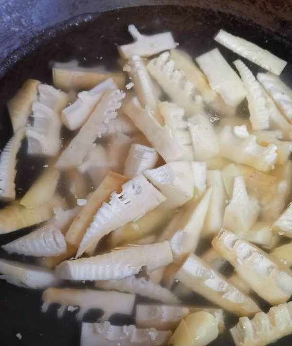 4、起鍋放水,放入少許鹽。水開後放入切好的竹筍焯水30秒,迅速撈出,去一下它的青澀味。