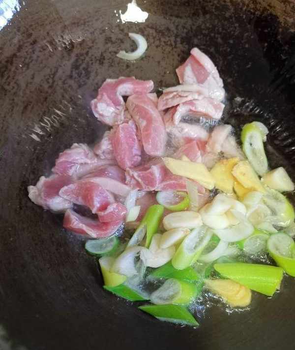 5、另起鍋放油,放入蔥、薑、蒜、豬肉及料酒翻炒至斷生。