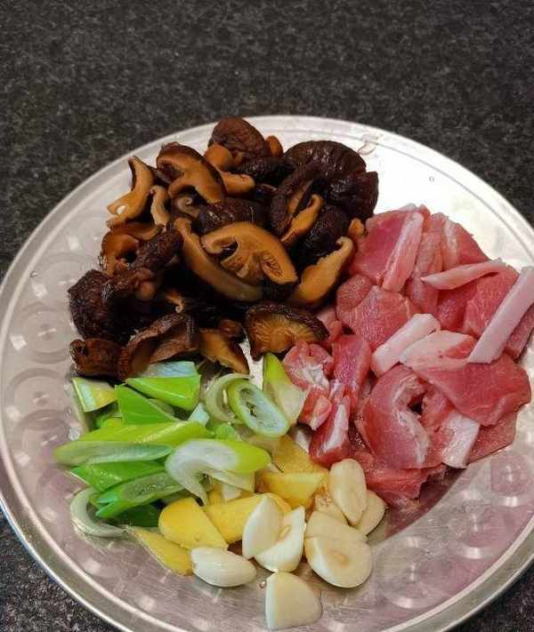 3、香菇提前浸泡、切成厚點的片。豬肉及蔥薑蒜也備好。