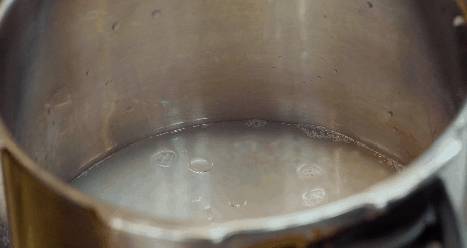 【2】煮飯靜置好的大米倒入高壓鍋中,加入適量水,水淹過米往上一厘米即可。繼續加入適量食鹽、植物油、醋,蓋上蓋子,壓力閥跳起來後,轉小火煮7分鐘。