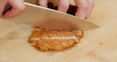 選用帶筋的豬排,反復進行捶打,肉質更鮮嫩;再進行醃制,更加入味;最後油炸,鎖住鮮味,增加酥脆口感。