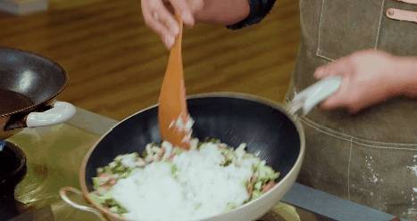 鍋中放入蟹味菇直接幹煸,宣威火腿切碎後放入菇中一起炒,加入上海青、適量水,再放入米飯翻炒均勻,加適量油、鹽,調味。