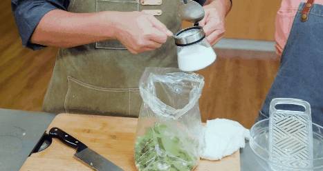 上海青切小段後,放入塑料袋中,加鹽醃漬。
