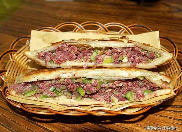 這道菜是華北地區最受歡迎的食物,起源於河北保定。簡單來說,它是“肉夾饃”,隻是肉是鹵驢肉,饃是河北當地的火燒,顏色金黃,吃起來味道酥脆,讓人停不下來。