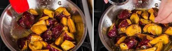9.不斷攪拌,直到達到合適的稠度。當可以在鍋上畫一條線時,加入地瓜。