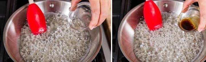 7.制作糖漿,將5勺糖,1?勺水和1勺米醋混合在一起,用中火煮沸。