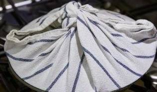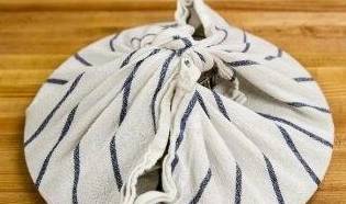 6.用廚房抹佈包住煎鍋的蓋子,這是為瞭防止烹飪時鍋蓋上的冷凝水滴落到地瓜中。