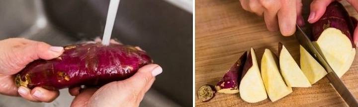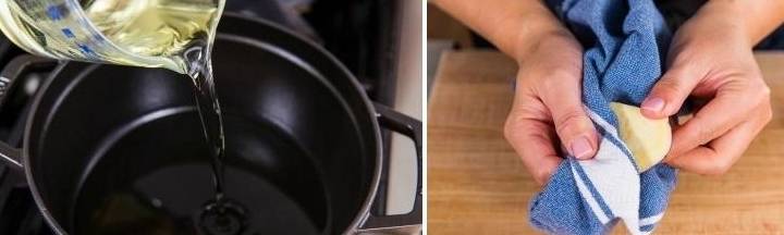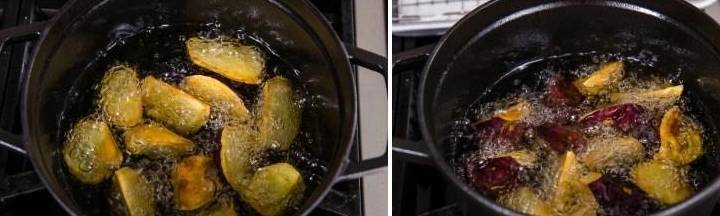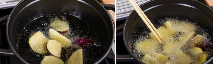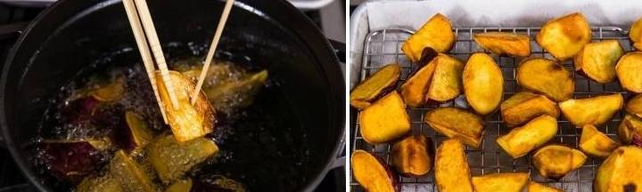 3.鍋中加油,加熱油溫至320oF(160oC)。同時,用幹佈(或紙巾)擦幹地瓜。